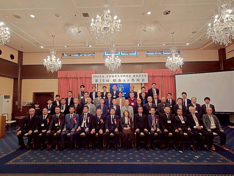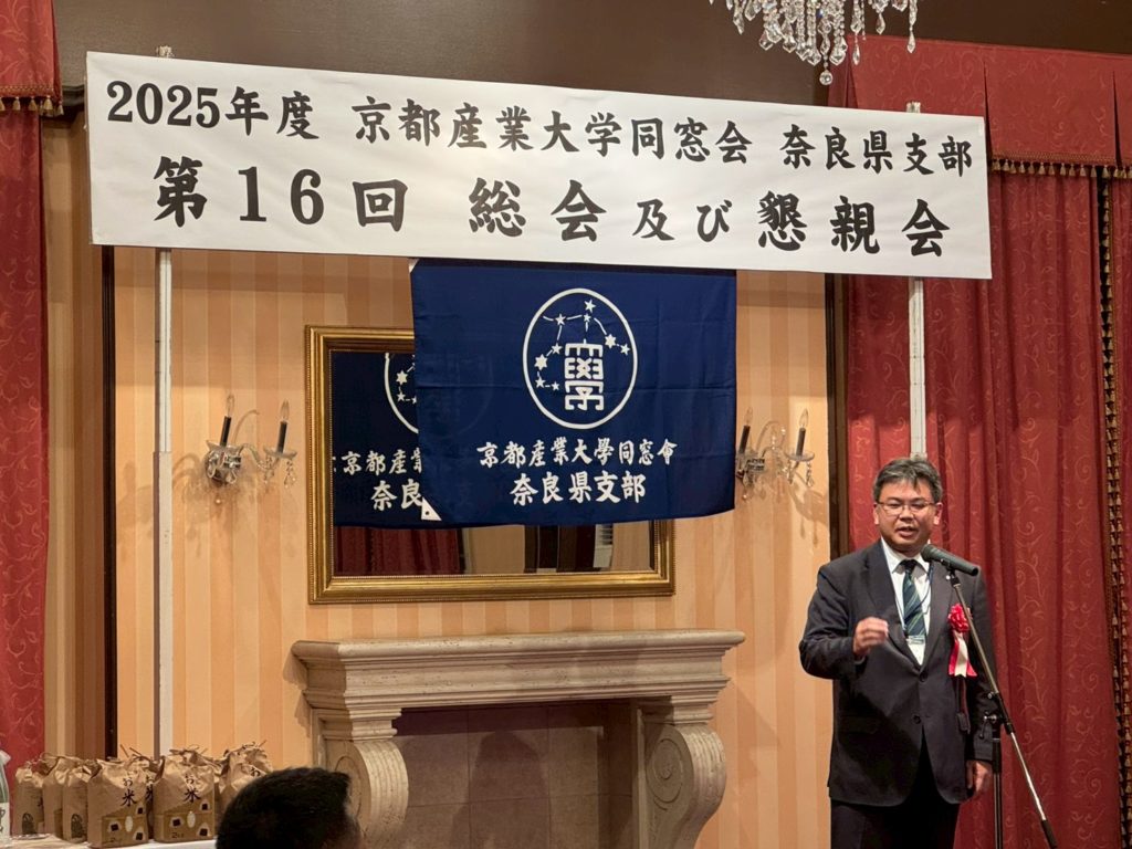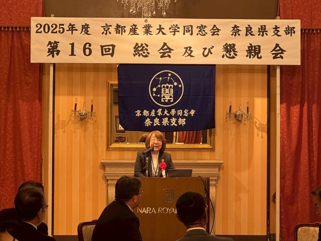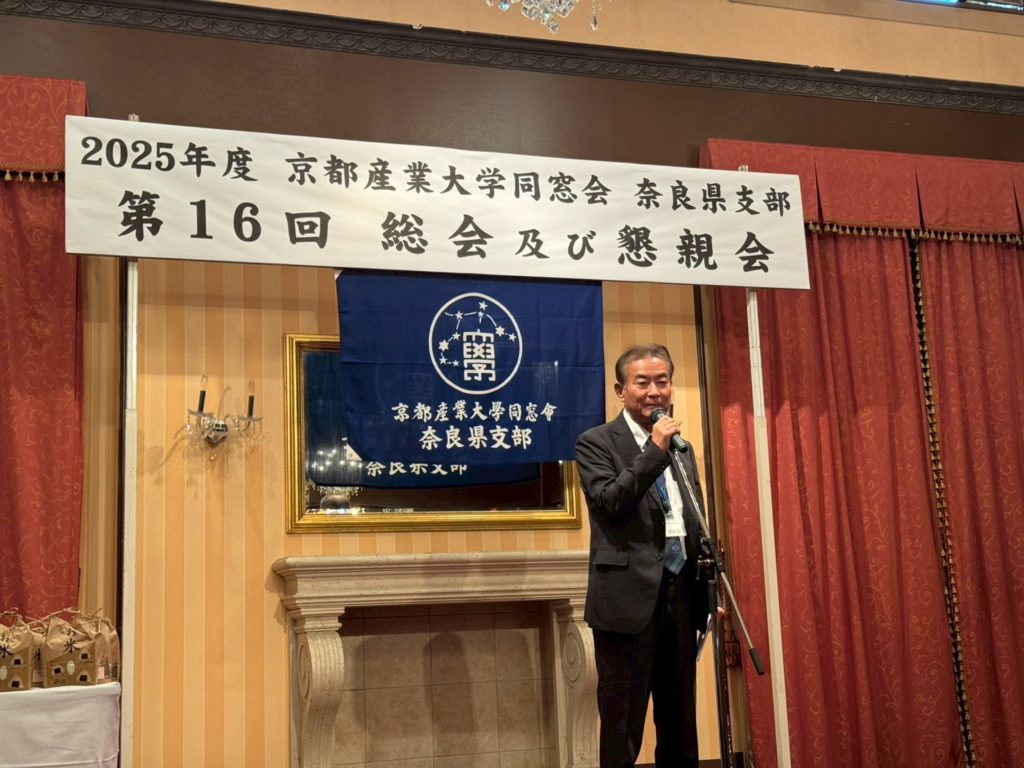 総会では、在間学長をお招きし、「京都産業大学の今とこれから」をテーマにご講演していただきました。内容は、大学を取り巻く環境が厳しい中でも「アントレプレナーシップ学環」の新設(2026年度~)を筆頭に、文理融合の起業家育成、DX推進による先進的教育、JAXA連携での宇宙開発、地域・産業界との連携強化などを軸にイノベーション創出と社会実装を担う人材育成、そして「教育の京都産業大学」実現に向けた改革を推進している取り組みについて力強くご説明していただきました。これらの取り組みは、「未来の産業界を担う人材育成」と「社会に貢献する大学」を目指す変革への挑戦を具体化したものであると強く感じることができました。